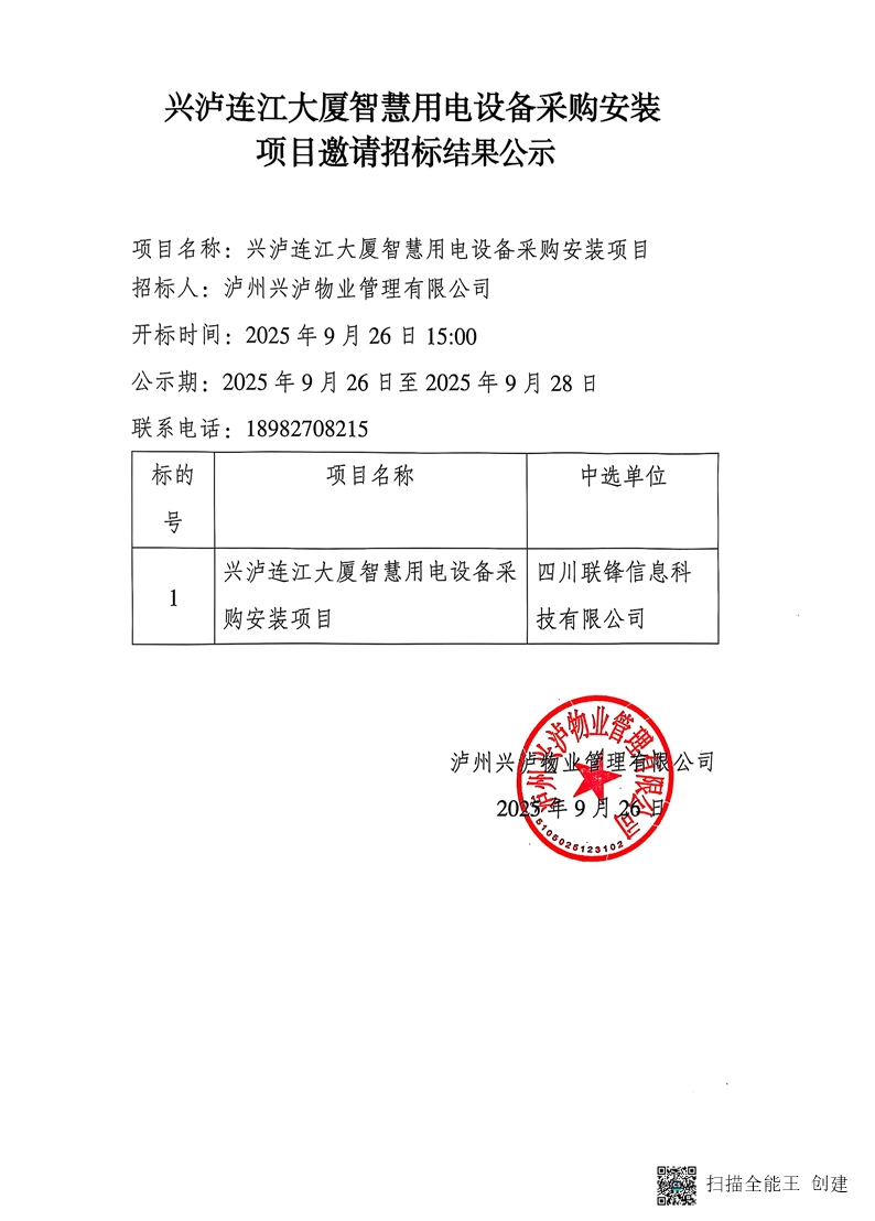 兴泸连江大厦智慧用电设备采购安装项目邀请招标结果公示
